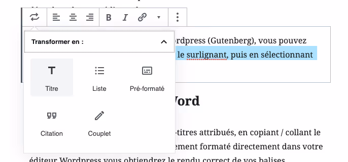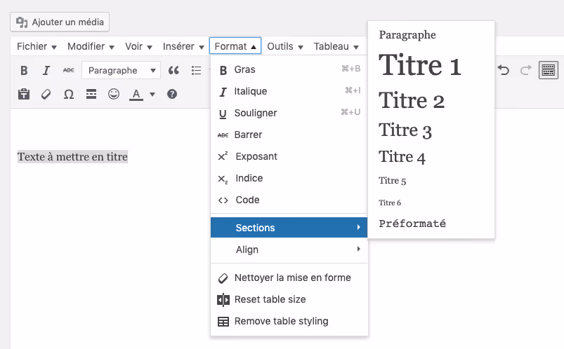 Si tu utilises l’ancien éditeur WordPress, tu peux formater un contenu (= les mots voulus) en le sélectionnant puis en lui attribuant un niveau via le menu déroulant de ton éditeur de texte ou via le menu format.