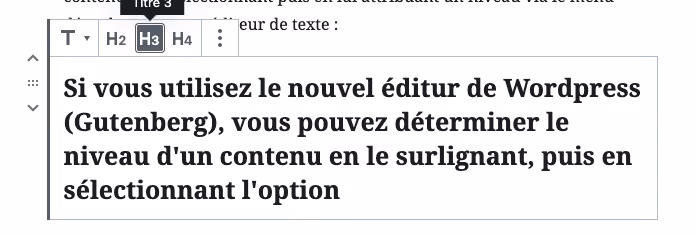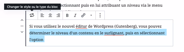 Si tu utilises le nouvel éditeur de WordPress (Gutenberg), tu peu déterminer le niveau d’un contenu en le surlignant, puis en sélectionnant l’option « Transformer en Titre » avec choix du niveau souhaité.