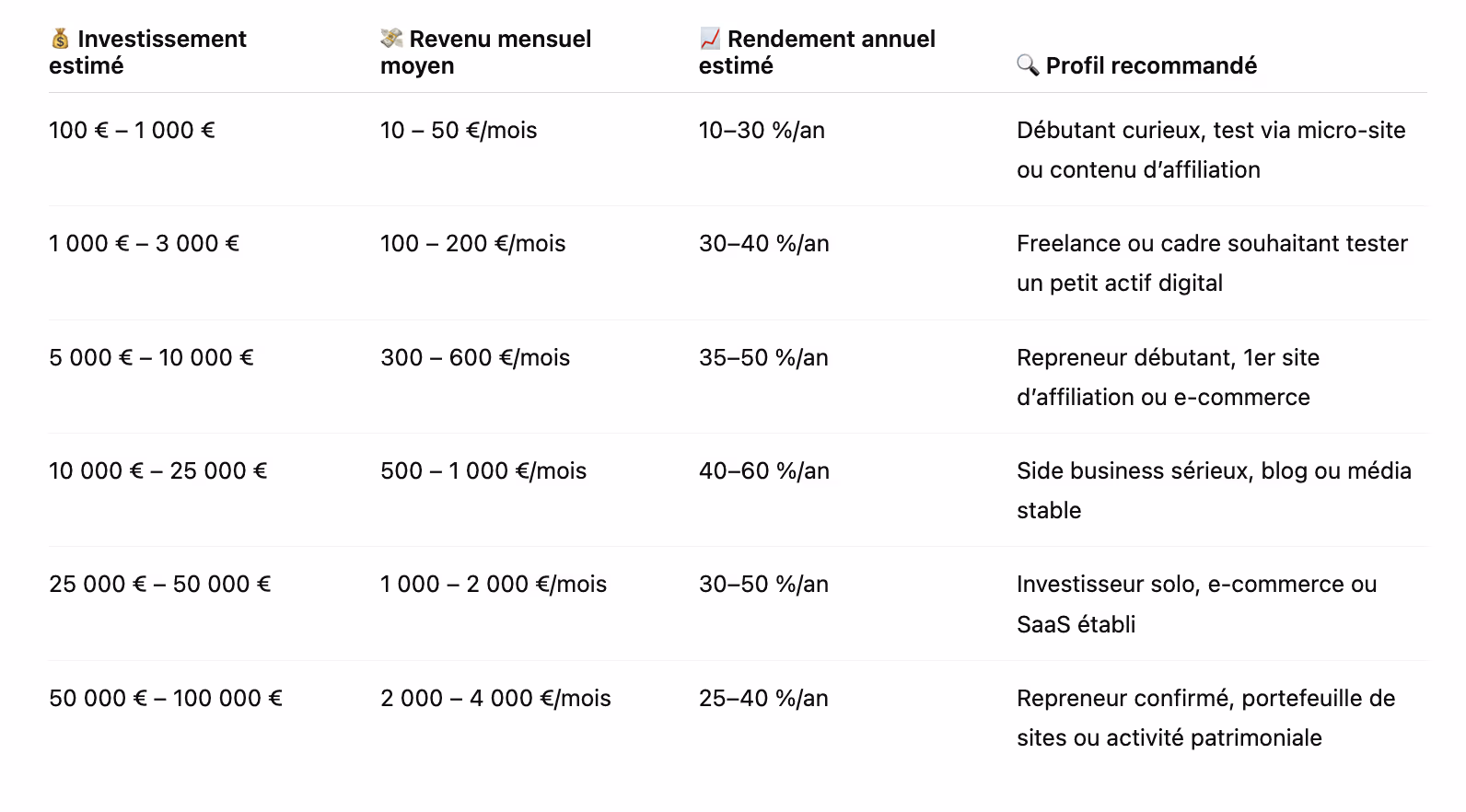 Tout dépend de vos objectifs. Il est possible de commencer dès 5 000 € avec un petit site d’affiliation, ou de viser des projets plus structurés entre 10 000 et 30 000 €, générant jusqu’à 1 000 €/mois de bénéfice net. Le web est le seul marché où vous pouvez acheter un actif rentable pour le prix d’une voiture.
