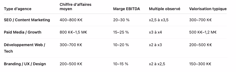 Les multiples les plus élevés se concentrent sur les modèles récurrents et scalables : SEO, Paid, marketing automation, ou data analytics.