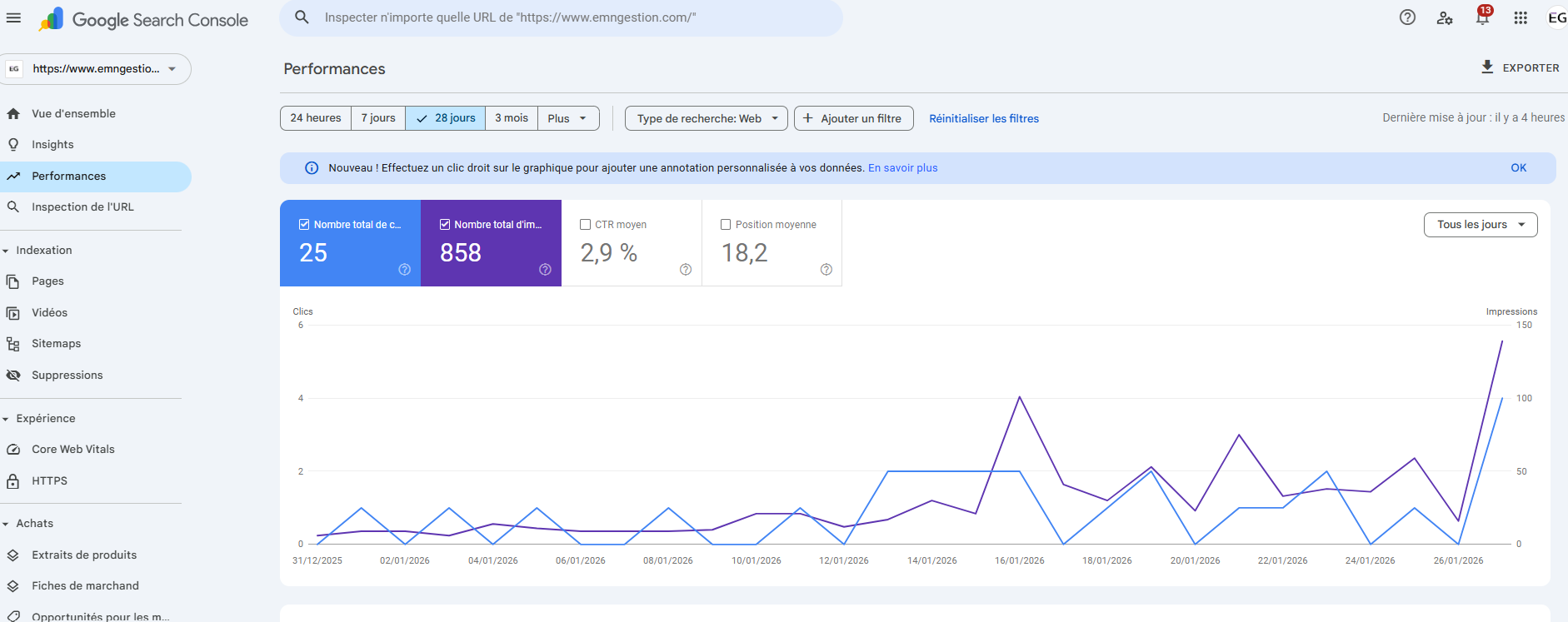 Google Analytics ayant été installé mi-décembre 2025, il n’y a pas d’historique disponible.