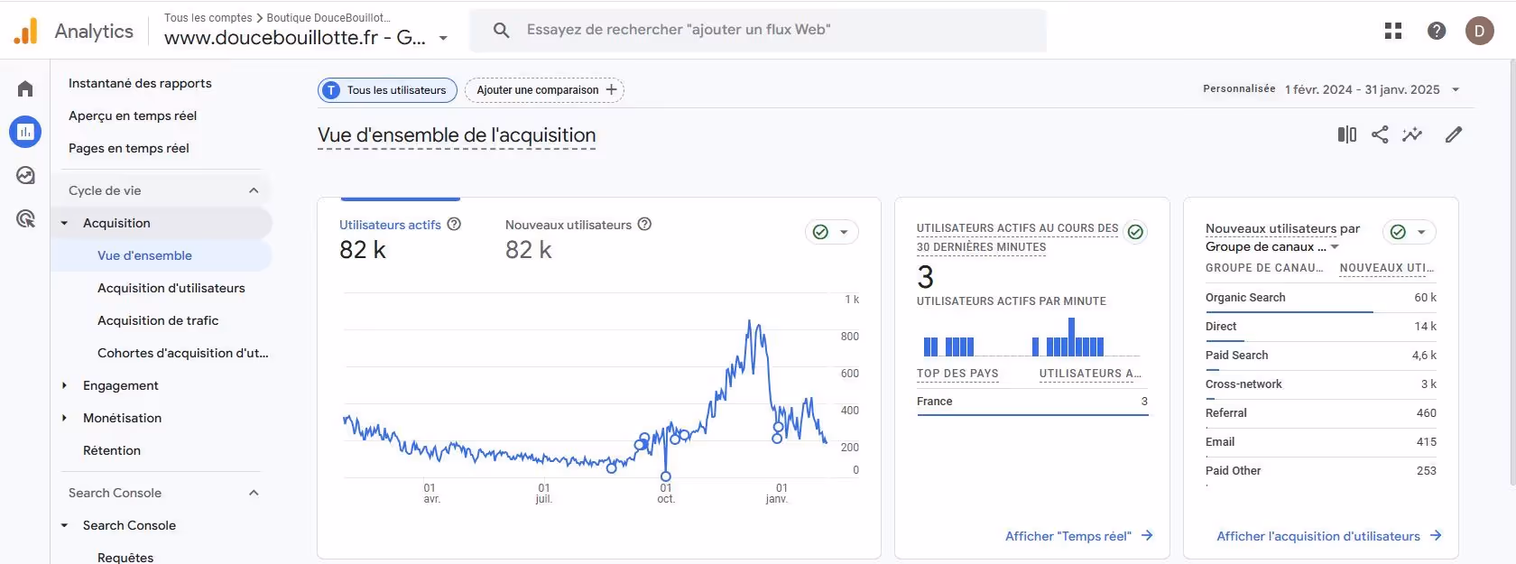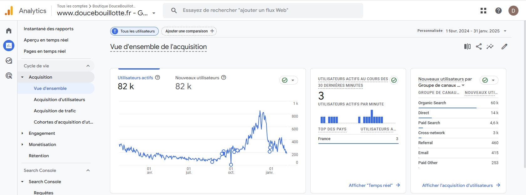 Sur le plan publicitaire, l’investissement actuel est limité à une campagne en saisonnalité forte. Il serait intéressant de tester une approche plus équilibrée en préparant la saison hivernale dès l’automne avec des campagnes de notoriété et de remarketing sur Meta Ads et Google Ads. Pinterest Ads pourrait aussi être un canal à explorer, notamment pour capter l’audience féminine qui constitue une grande partie des acheteurs potentiels.