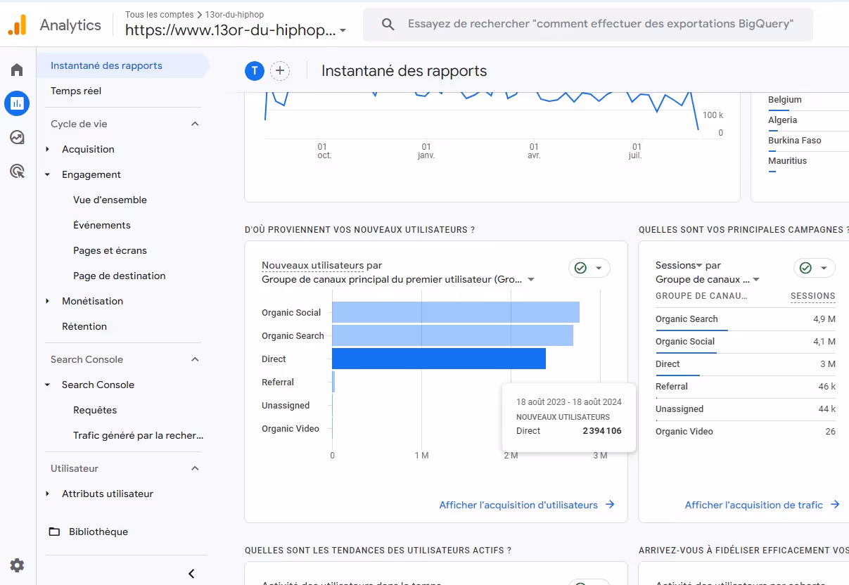 Il y a souvent des pics de trafic en fin d'année, plus d'actualités dans le domaine cible et une baisse en juillet-aout. Il y a eu une baisse de trafic de Discover en début 2024 suite à la sortie du site de Discover (Update Google) avant d'être réintégré en mars. Le trafic des réseaux sociaux a chuté ces derniers mois en raison des modifications d'algorithme de Facebook.